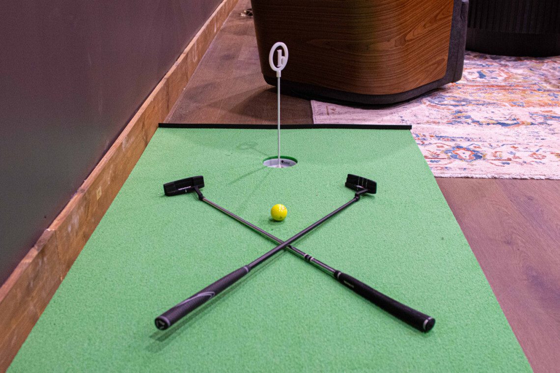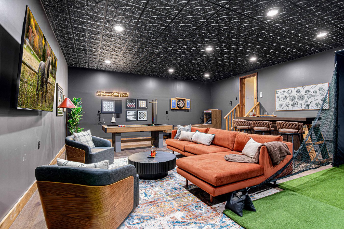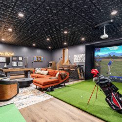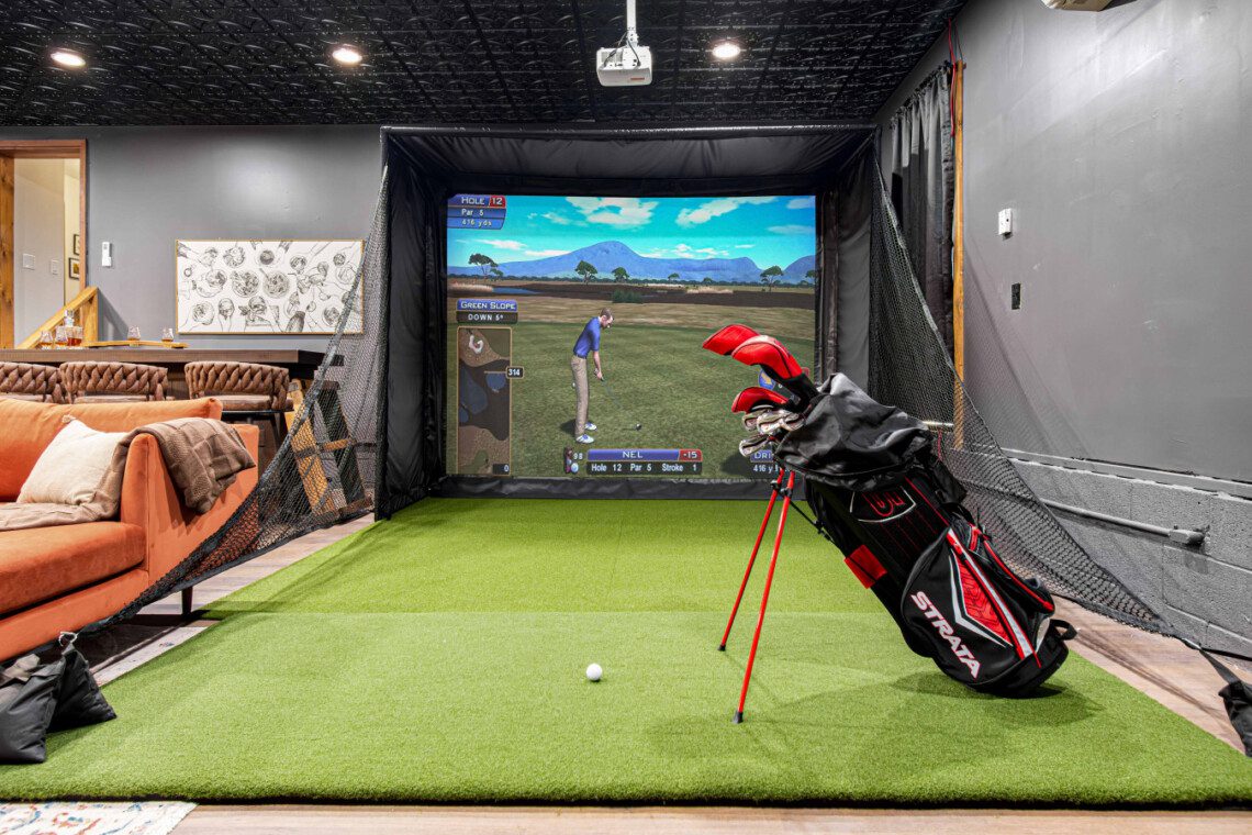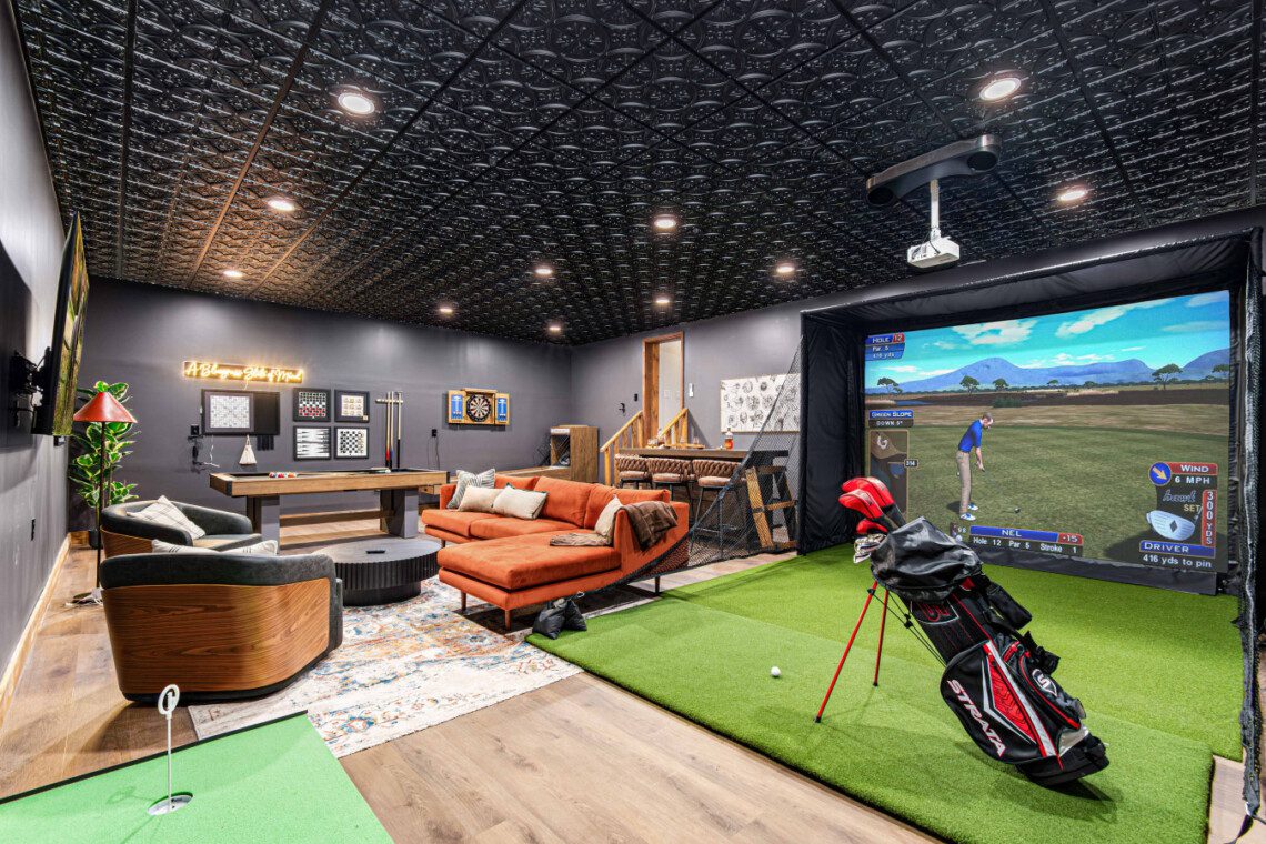 ► Large media room with golf simulator, putting green, pool/billiards table, bar, dart board, skee-ball and 75″ Smart TV