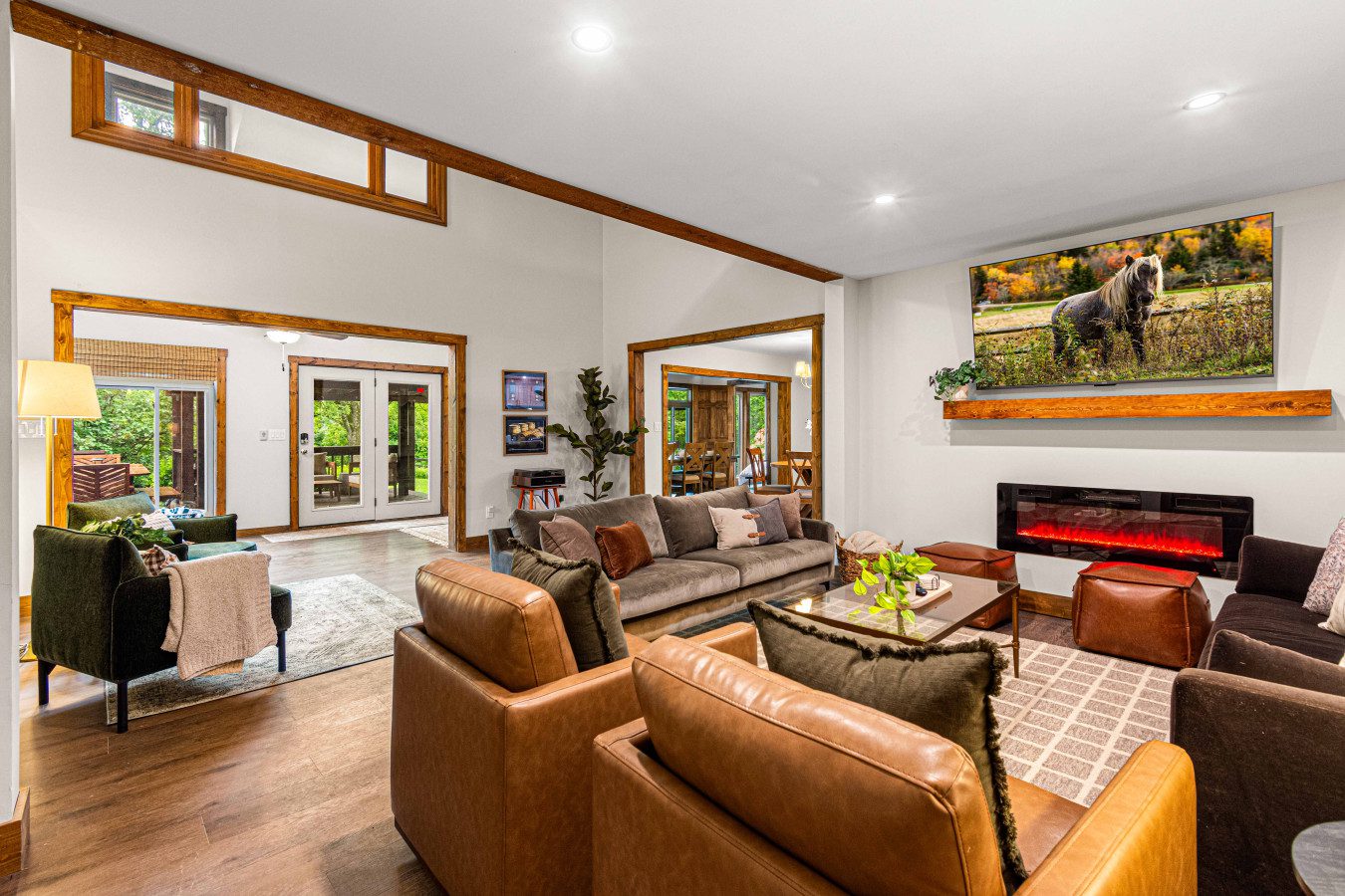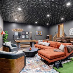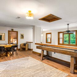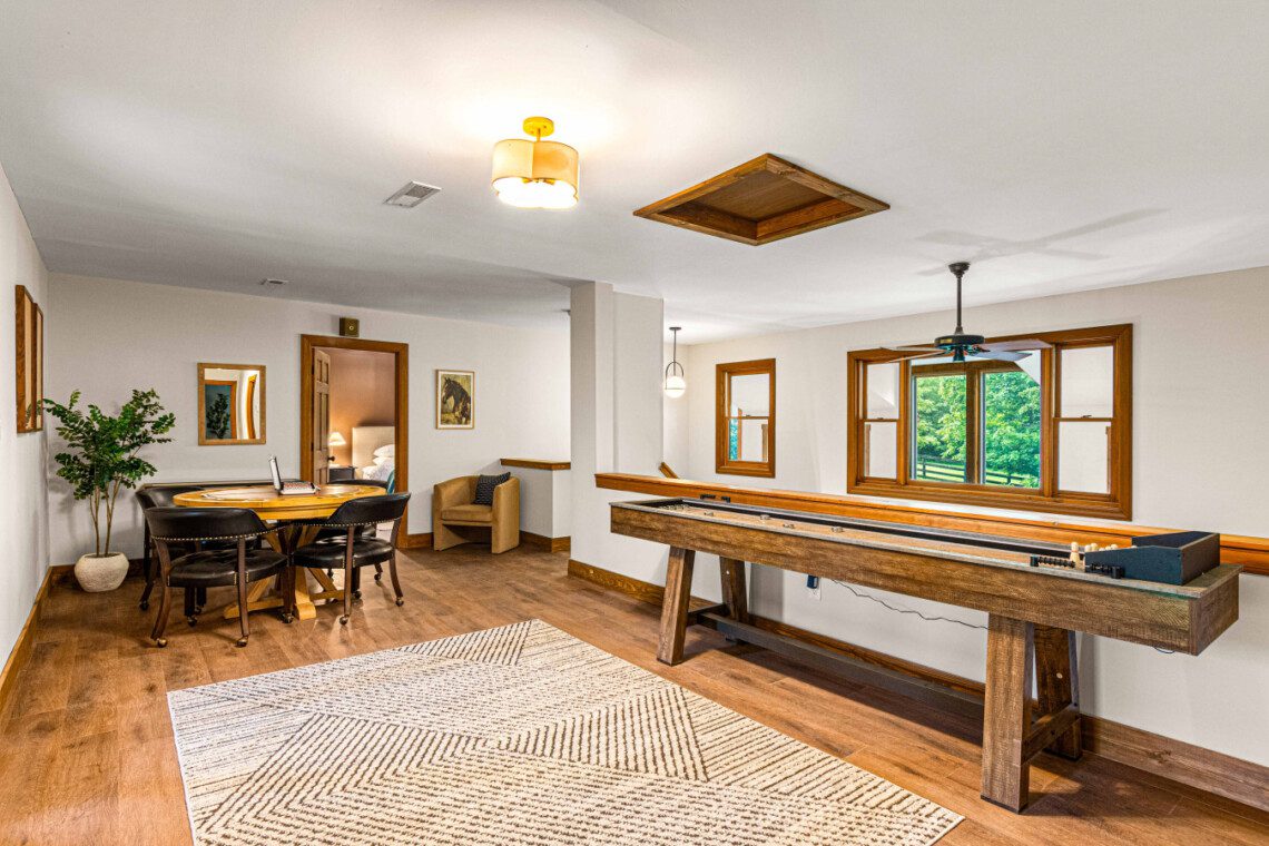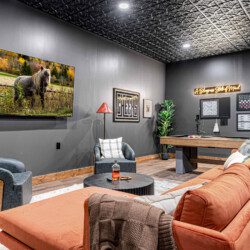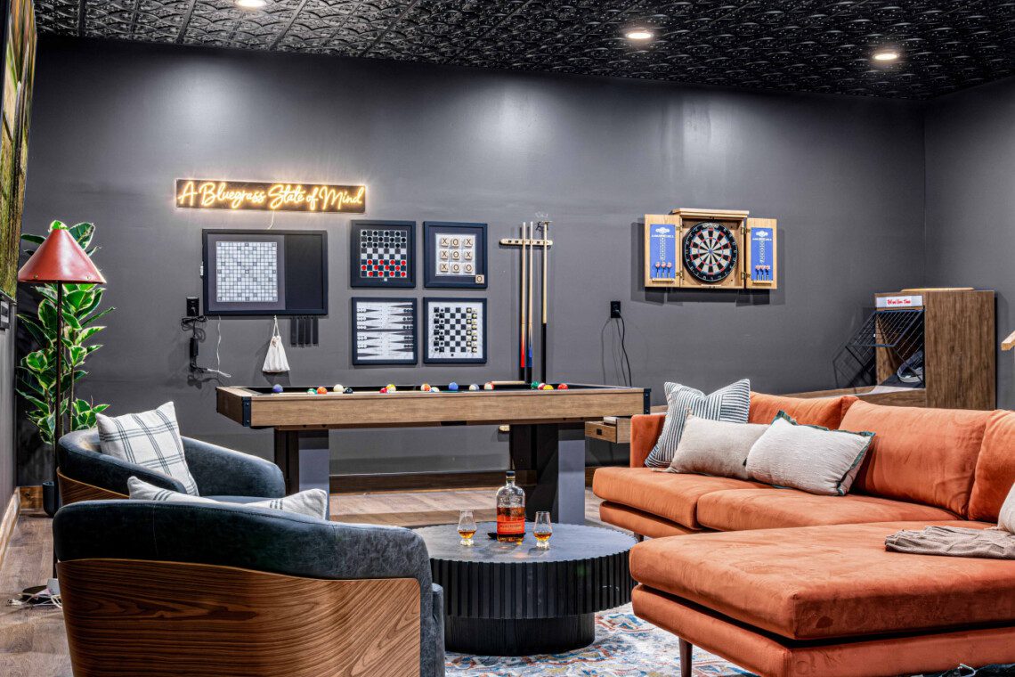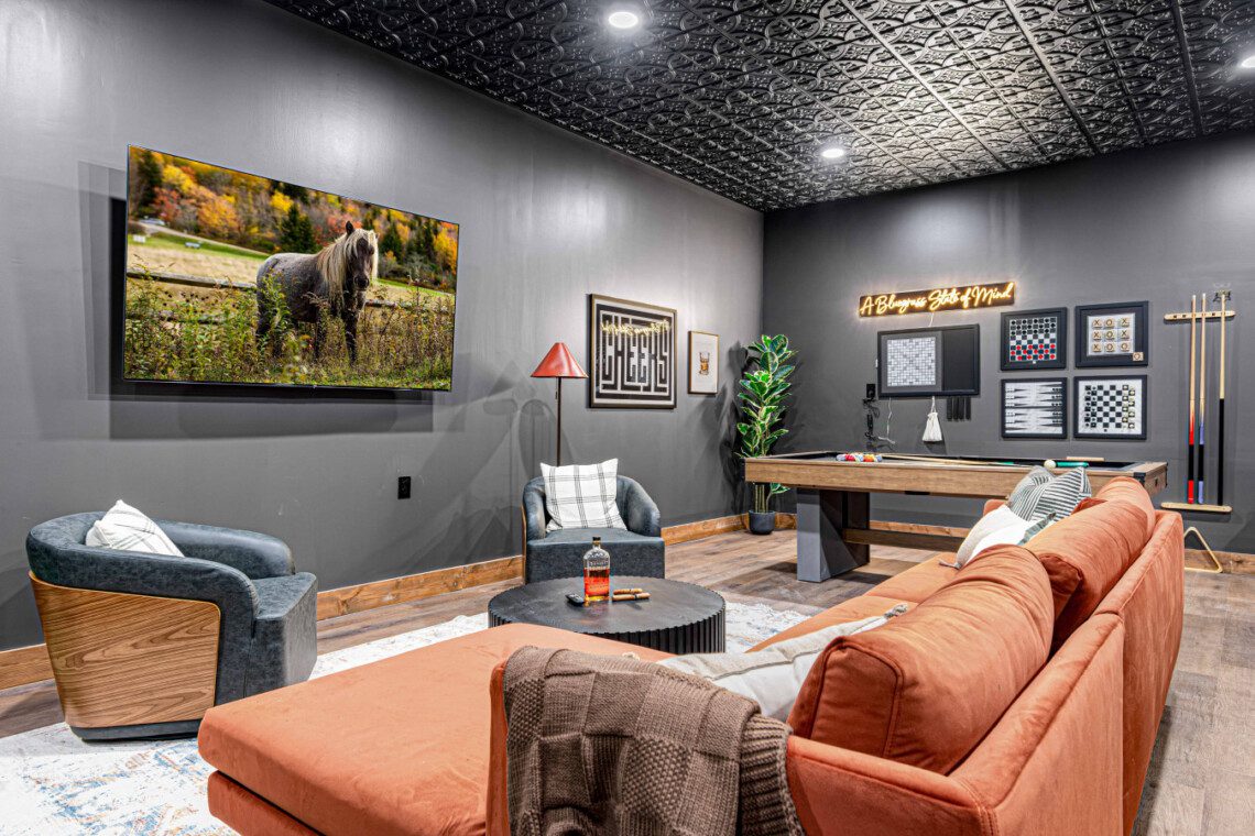 ► Large media room with golf simulator, putting green, pool/billiards table, bar, dart board, skee-ball and 75″ Smart TV